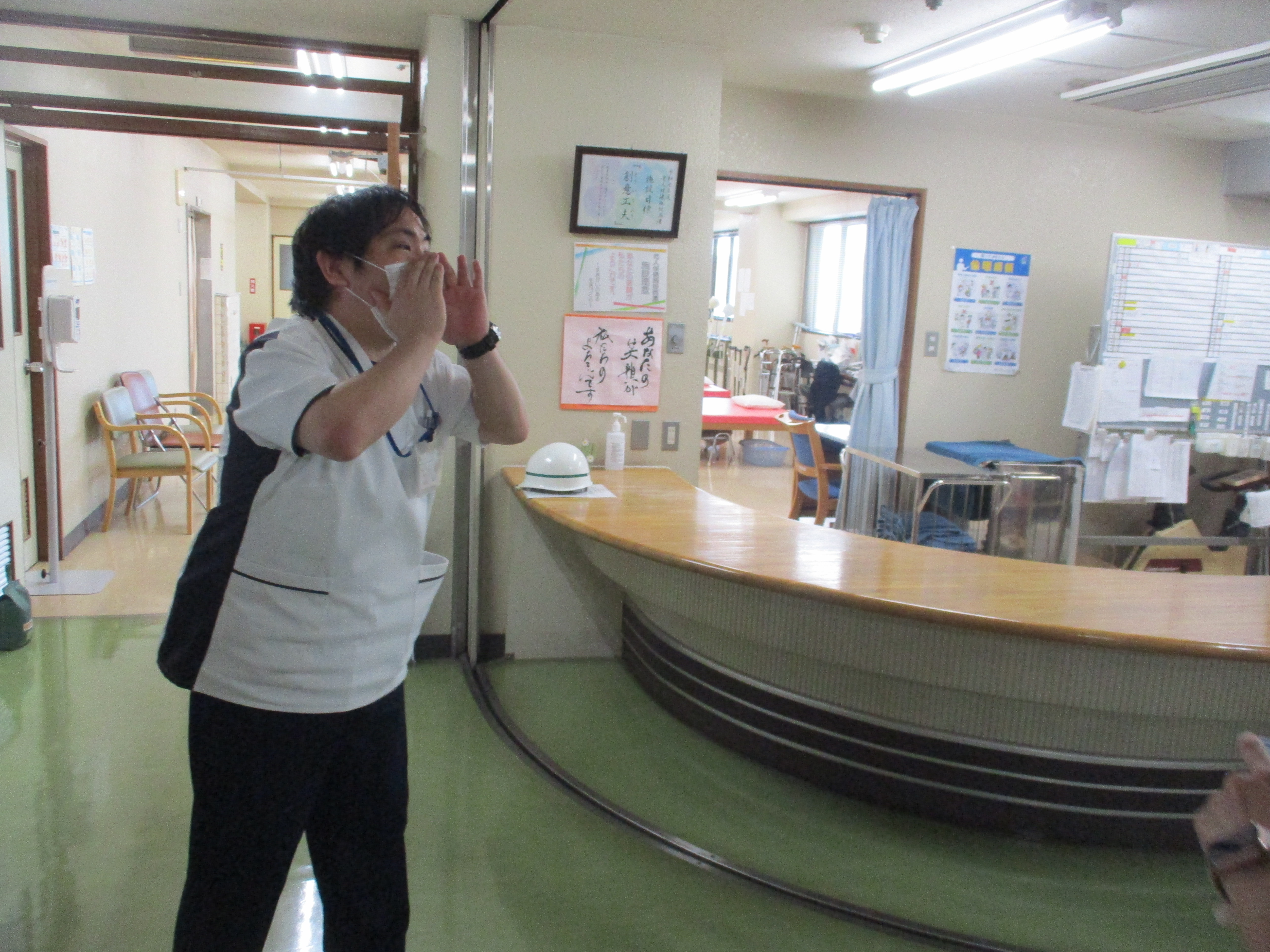 消防訓練 9月26日(金)、名和病院と合同で消防訓練を行いました。 施設内での火災を想定し、火災発見・通報・初期消火・救護活動・安全な場所への避難誘導を行いました。 消火器の取り扱い方法の指導を受け、参加した職員が消火器での消火訓練を体験しました。 日頃から訓練を行い、万一の時の為に備えていきます。