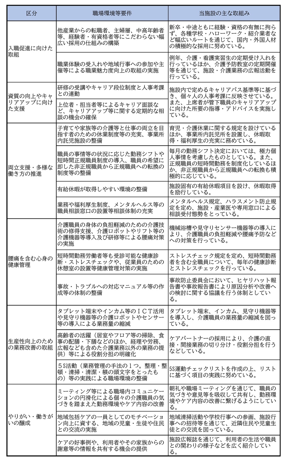 当施設における処遇改善加算への取り組みについて 当施設では、介護職員等の処遇改善に向けて、以下のとおり賃金改善や職場環境改善に取り組んでいます。 ① 賃金改善への取り組み ・介護職員等処遇改善加算の取得状況 …介護職員等処遇改善加算(新加算Ⅱ)を取得しています。 ・賃金改善を行う方法 …毎月の給与において処遇改善手当(固定手当)を支給しています。② 職場環境改善への取り組み 賃金改善のほか、以下のような職場環境改善への取り組みに努めています。