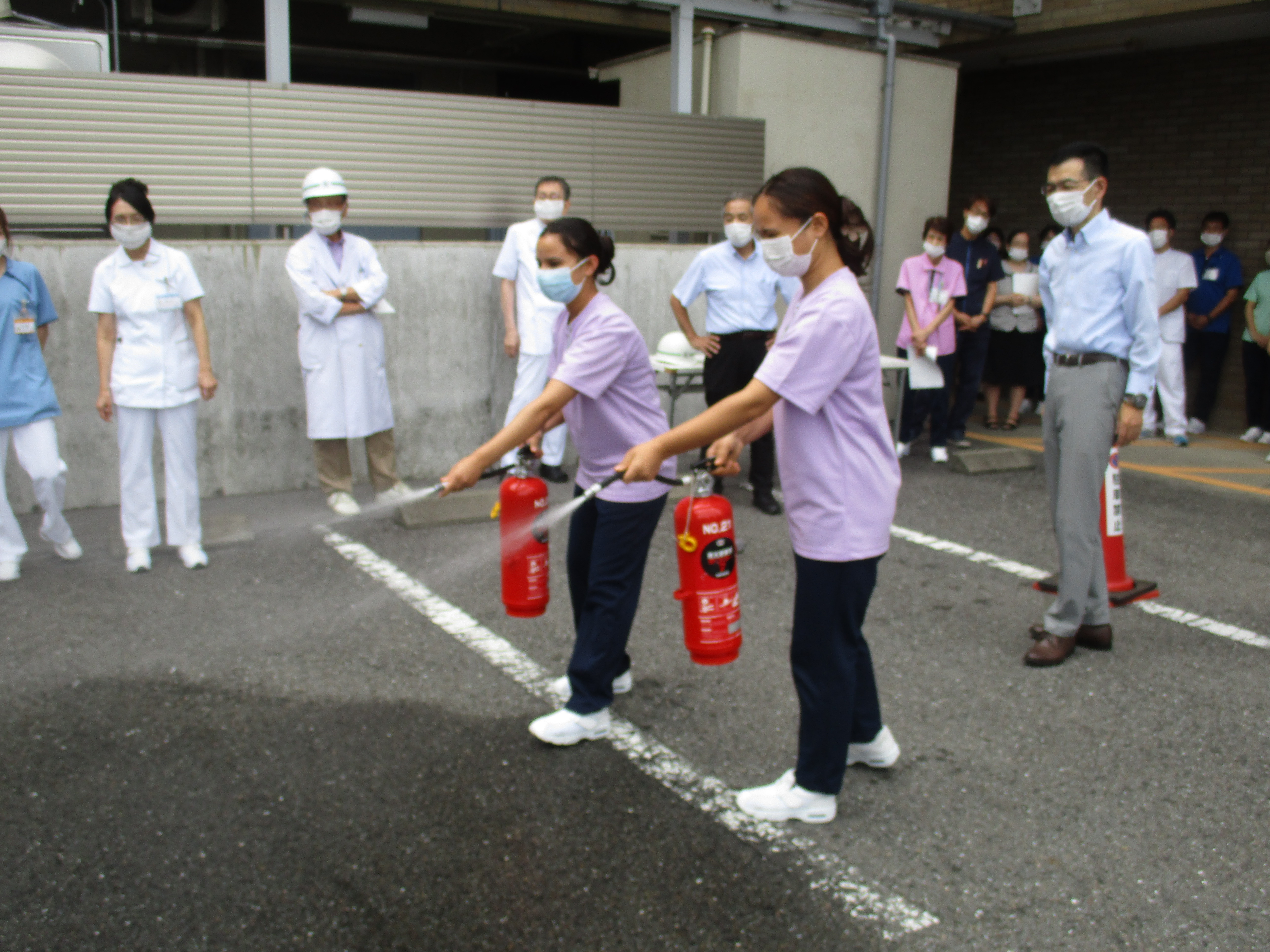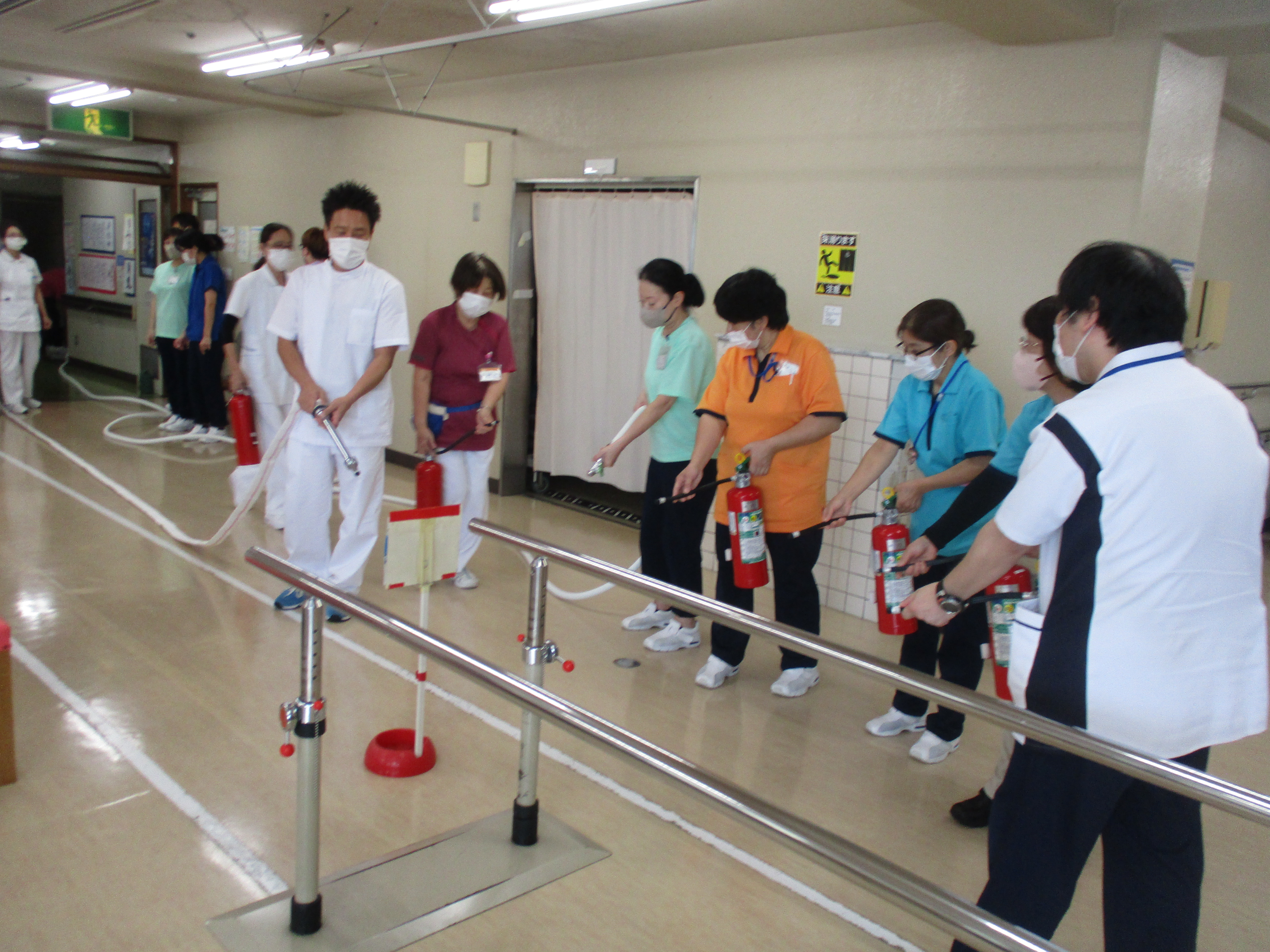 消防訓練 9月26日(金)、名和病院と合同で消防訓練を行いました。 施設内での火災を想定し、火災発見・通報・初期消火・救護活動・安全な場所への避難誘導を行いました。 消火器の取り扱い方法の指導を受け、参加した職員が消火器での消火訓練を体験しました。 日頃から訓練を行い、万一の時の為に備えていきます。